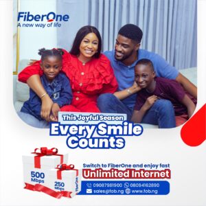 Bring your loved and cherished ones closer to you this season no matter the distance. FiberOne offers you the fastest and most reliable internet connectivity to enjoy the goodness of the season. Get truly UNLIMITED internet with any of our smart home plans starting from as low as N11,994 per month. Switch today and experience a new way of life this Christmas with the superfast FiberOne broadband. Call us at 0700FIBERONE or visit www.fob.ng to get started. This Joyful season, every smile counts with FiberOne Broadband.